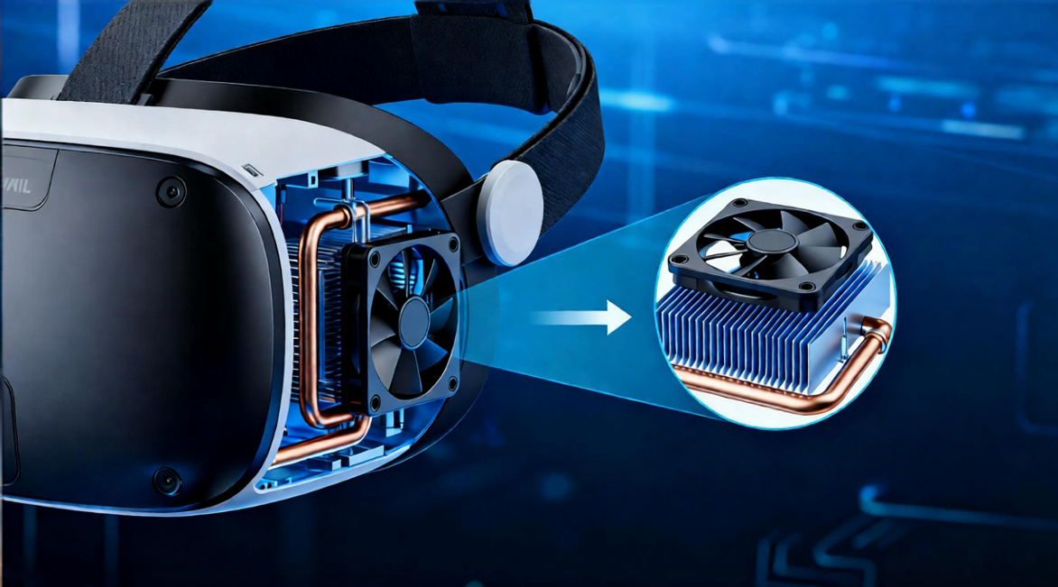 1.风冷系统:在VR头显里安装微型风扇,把芯片产生的热量直接吹走。这一散热方式结构简单、成本较低,还能有效降低热阻,运行时几乎无声、无震动,是目前主流VR设备最常用的主动散热方案。